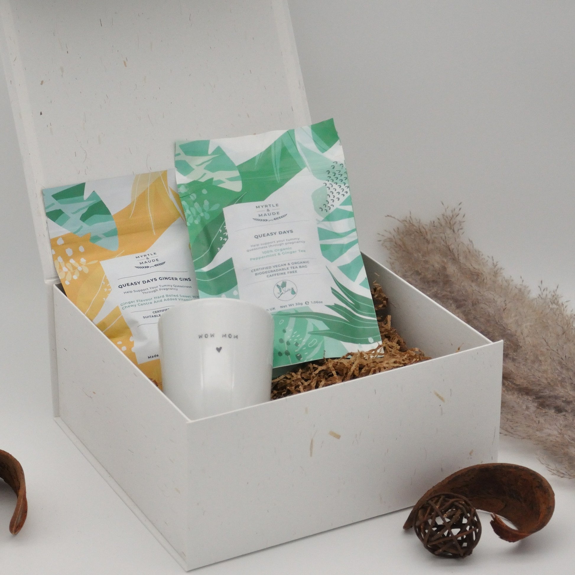 Surprise a mom-to-be with our carefully curated gift box, perfect for relieving morning sickness and bringing a smile. This beautiful set contains three premium products, presented in an elegant Wowwy gift box